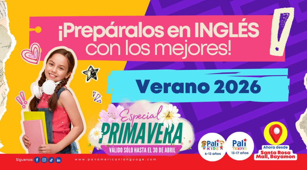 Nuestros próximos cursos grupales intensivos para PALI Kids (6-12 años) y PALI Teens (13-17años) están pautados para comenzar en VERANO 2026 Presencial/Híbrido en el 4to Nivel del Santa Rosa Mall en Bayamón o 100% Virtual. ¡El estudiante escoge como tomar cada clase! Los cursos tienen una duración de treinta y dos (32) lecciones que equivalen a 24 horas contacto.  Para medir el aprovechamiento del estudiante al terminar el curso recibirá una evaluación final. En PanAmerican Language creemos en que la manera más efectiva de aprender un idioma es mediante la inmersión.  Por lo tanto, sólo se le habla a los estudiantes en el idioma que están aprendiendo. A continuación encontrarás el detalle de las fechas de comienzo, fechas de terminación, días y horarios: